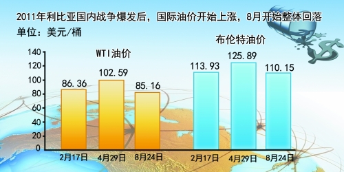 利比亞國內(nèi)戰(zhàn)爭2011年爆發(fā)后,國際油價開始上漲,并于4月底達到高點。5月5日,油價大跌10美元/桶左右,隨后維持震蕩走勢。2011年8月,油價開始整體回落。