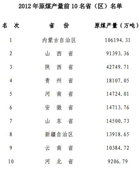 為促進煤炭工業(yè)健康可持續(xù)發(fā)展,加快煤炭產(chǎn)業(yè)結(jié)構(gòu)調(diào)整,全面反映全國重點產(chǎn)煤省(區(qū))、地(市)、縣(市)煤炭工業(yè)情況,9月23日,中國煤炭工業(yè)協(xié)會向全社會發(fā)布2012年前10名產(chǎn)煤省(區(qū))、前100名產(chǎn)煤地(市)、前100名產(chǎn)煤縣(市)原煤產(chǎn)量。