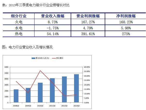 從細分行業(yè)看,收入方面,熱電企業(yè)收入增長繼續(xù)位于前列,達到54.14%;而火電和水電企 業(yè)與熱點企業(yè)收入增長相差較大,火電營業(yè)收入同比增長8.7%,水電則下降1.75%,繼續(xù)為負。細分行業(yè)收入增長延續(xù)分化。由于下游用電處于旺季,加上 持續(xù)高溫天氣影響,水電來水大幅下滑,對火電發(fā)電擠壓減小,雙重因素使得火電企業(yè)三季度收入增長繼續(xù)好轉(zhuǎn)。對于水電,二季度開始,汛期不如去年同期,三季 度同比則大幅下降,導致水電企業(yè)的收入持續(xù)下降。