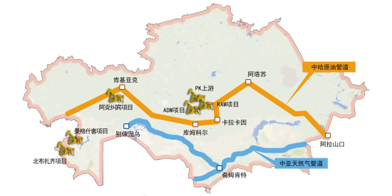 全長(zhǎng)2830公里的中哈原油管道,經(jīng)阿拉山口直接通往中國(guó)的煉油廠。起自土庫(kù)曼斯坦、全長(zhǎng)1794公里的中亞天然氣管道,在哈薩克斯坦境內(nèi)約1300公里,經(jīng)南部的江布爾州,穿越阿拉山口將“藍(lán)金”送到中國(guó)的千家萬戶。而中國(guó)石油在與哈薩克斯坦的能源合作中,截至2012年底,累計(jì)上繳稅費(fèi)230多億美元,公益事業(yè)支出2.5億美元以上,提供就業(yè)崗位2.8萬多個(gè)。