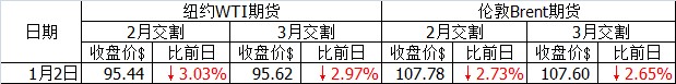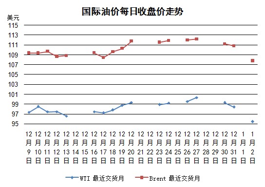 1月2日國際石油期貨價(jià)格大跌。美元當(dāng)日對歐元走強(qiáng),以美元定價(jià)的原油價(jià)格給人以較高的感覺,促使油價(jià)下行。另外,中國國家統(tǒng)計(jì)局公布的12月PMI數(shù)據(jù)低于前一月,這也利空油價(jià)。美國經(jīng)濟(jì)數(shù)據(jù)空多交織,首次申請失業(yè)保險(xiǎn)人數(shù)比前一周小幅改善,減少2000人至33.9萬人,但美國供給管理協(xié)會(huì)公布的12月美國制造業(yè)PMI為57.0,低于前一月的57.3。
