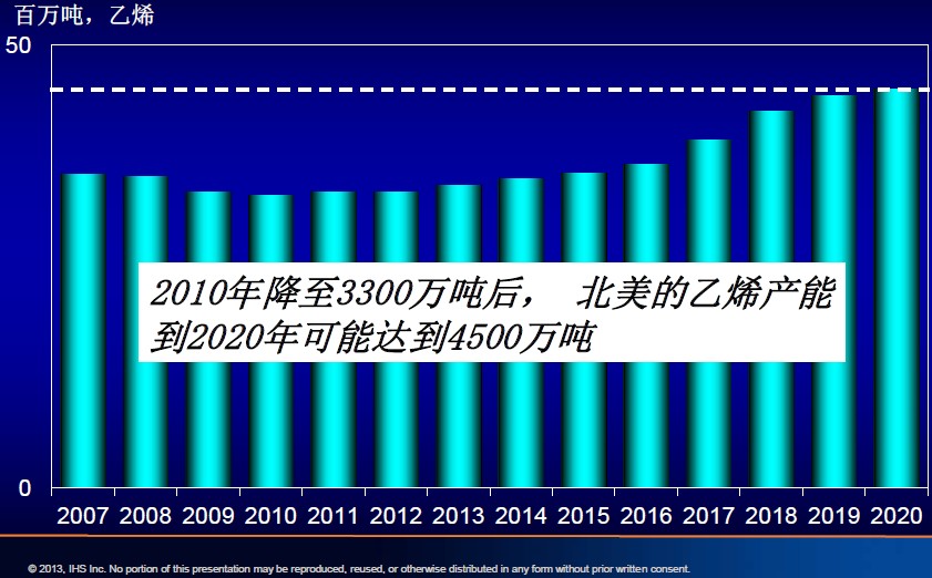 IHS預(yù)計北美乙烯產(chǎn)能在2020年可能達(dá)到4500萬噸,這很可能成為北美自2010年產(chǎn)量跌至谷底3300萬噸后的一次漂亮扭轉(zhuǎn)。