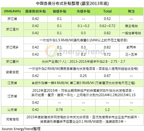 除了中國國家財政對于分布式系統(tǒng)的補貼外,各省、市級單位都為刺激地方發(fā)展提出各自補貼方案,吸引更多系統(tǒng)商與資金投入。但在此背景下,尚須觀察各省、市制定的補貼條件與金額是否合理,因從另一方面觀察,這樣的補貼政策會被視為地方補貼當(dāng)?shù)仄髽I(yè)的一種方式,但對于計劃進入的非省、市內(nèi)的企業(yè)反而成了屏障。