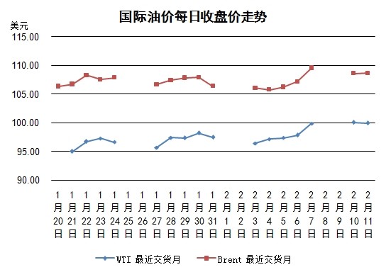 由于預(yù)計(jì)美國原油庫存將出現(xiàn)增加,而且前一日WTI價(jià)格超過100美元,市場警戒感增強(qiáng),所以當(dāng)日WTI價(jià)格小幅下跌。聯(lián)儲(chǔ)局主席耶倫出席眾議院金融服務(wù)委員會(huì)聽證會(huì),表示會(huì)延續(xù)前任主席伯南克的貨幣政策,繼續(xù)以漸進(jìn)的方式縮減買債規(guī)模。耶倫指,該方針改變的門檻設(shè)得頗高,除非經(jīng)濟(jì)前景出現(xiàn)顯著變化,否則不會(huì)減慢買債步伐。聯(lián)儲(chǔ)局需時(shí)審視近日新增非農(nóng)就業(yè)人數(shù)低於市場預(yù)期所帶來的重要性,但她重申,并無既定路線縮減資產(chǎn)購買。美國股市受到提振,但WTI油價(jià)反應(yīng)有限。倫敦布倫特油價(jià)受嚴(yán)寒天氣持續(xù)和餾分油庫存預(yù)減影響當(dāng)日小幅上漲。
