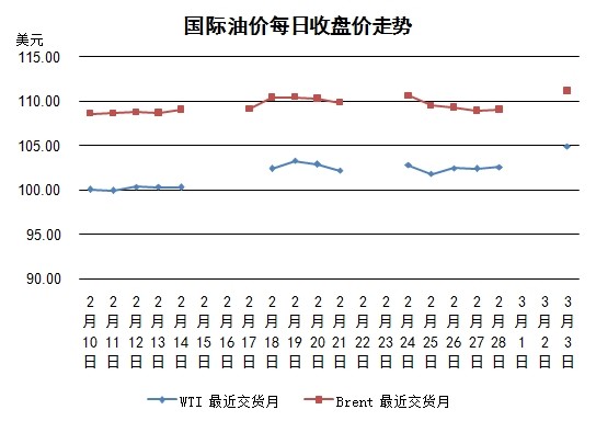 3月3日國際油價大漲,WTI期貨價格為5個半月以來最高,布倫特期貨價格則為去年12月30日以來最高。俄羅斯可能軍事介入烏克蘭,并引發(fā)俄羅斯同美國及西歐國家的對立。俄羅斯是油氣出口國,因此市場擔(dān)心烏克蘭局勢升級將影響原油供給關(guān)系。外匯市場美元對歐元走高,不利于油價上漲,但是原油當(dāng)日依然保持堅挺。烏克蘭稱俄羅斯正在離克里米亞最近的狹窄水域附近集結(jié)武裝車輛。周末俄羅斯總統(tǒng)普京稱為了保護俄羅斯利益和公民他有權(quán)對烏克蘭動武。