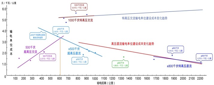 3.得到的結(jié)果是可以形成遠(yuǎn)距輸電的規(guī)律,而不是個(gè)案說(shuō)法:如果我們把中國(guó)遠(yuǎn)距輸電工程的造價(jià)進(jìn)行整理,就可以得到這樣的規(guī)律:6、7百公里以下,采用交流超高壓輸電最經(jīng)濟(jì),輸電以遠(yuǎn)采用直流輸電,交流特高壓輸電至少要貴出一倍,沒(méi)有適用的經(jīng)濟(jì)距離??捎孟聢D表示。