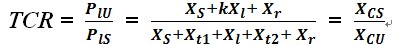 1)在送、受端系統(tǒng)不變的情況下,同一條輸電線路在1000千伏運(yùn)行時(shí)的輸電容量PlU與500千伏運(yùn)行時(shí)的輸電容量PlS之比TCR為: