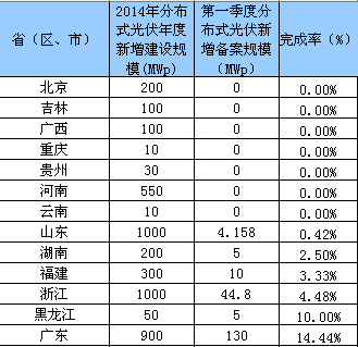 山東作為分布式光伏發(fā)展大省,2014年第一季度新增分布式備案容量僅0.415萬千瓦,約占年度規(guī)模的0.42%。此外,浙江省2014年度分布式光伏建設指導規(guī)模為100萬千瓦,而第一季度僅新增備案4.48萬千瓦;廣東第一季度分布式光伏建設情況較好,但新增備案容量也僅有13萬千瓦。(具體情況見下表)。