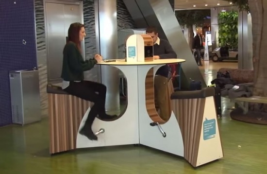 這種“桌椅”名為“WeBike”,用戶坐在上邊踩腳踏板騎單車,桌椅原地不動(dòng),卻能同時(shí)為擺在桌面上的電腦、手機(jī)和無線路由器等設(shè)備供電,工作運(yùn)動(dòng)兩不誤。