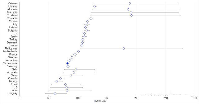 2014年第二季度度電成本—岸上風電—按國家($/MWh)