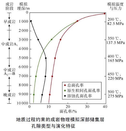 利用成巖物理模擬實(shí)驗(yàn)裝置,設(shè)計(jì)不同的溫壓條件,模擬儲(chǔ)集層沉積成巖后經(jīng)受的早期慢速壓實(shí)-后期快速壓實(shí)作用,再現(xiàn)不同沉降階段儲(chǔ)集層孔隙的演化特征,量化不同孔隙類(lèi)型及含量。