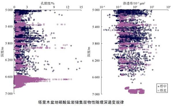 礁灘、白云巖、風(fēng)化殼型儲(chǔ)集層是碳酸鹽巖中最重要的儲(chǔ)集層,其最大特點(diǎn)是次生孔隙發(fā)育。從儲(chǔ)集層物性隨深度演化關(guān)系看(見(jiàn)圖),總體上孔隙度和滲透率較為穩(wěn)定。