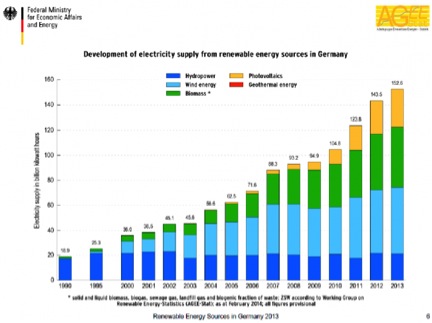 德國從2010年至2012年安裝了顯著的22GW的太陽能(平均每年安裝7GW),在2013年放緩至大約一半的年增長率,并在2014年進(jìn)一步放緩到改革之前。成為其自身成功的犧牲品,2014年德國的立法機(jī)構(gòu),國會(huì)大廈,在德國總理安格拉˙默克爾的支持下,制定額外的長期Energiewende改革,旨在減緩的增長率和改變定價(jià)機(jī)制的新合約。