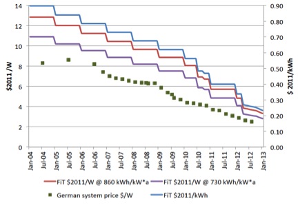 EEG落實(shí)上網(wǎng)電價(jià)制度的各種技術(shù),價(jià)格設(shè)置管理發(fā)展水平被視為必要的刺激。價(jià)格自開始以來已經(jīng)下調(diào)無數(shù)次了,設(shè)計(jì)一種機(jī)制,以促進(jìn)早期發(fā)展和成本快速下降。圖2顯示了10KW以及低于10KW的太陽能上網(wǎng)電價(jià)系統(tǒng)的歷史(利率相較于較大的系統(tǒng)較低,而比其他技術(shù)更低,如風(fēng)能和生物質(zhì)能)。從2004年到2013年上網(wǎng)電價(jià)補(bǔ)貼價(jià)格下降了74%,其中,如下圖所示,整個(gè)系統(tǒng)價(jià)格的相關(guān)性非常好(綠色方塊)。