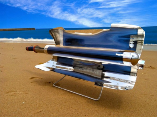 該款燒烤用具名為“GoSun”,發(fā)明者舍溫表示,他某次移走天臺的太陽能熱水系統(tǒng)時,發(fā)現(xiàn)板下的水管即使在陰天依然保持高溫,他突發(fā)奇想把一條熱狗腸放進(jìn)去,10分鐘后,熱狗腸完全煮熟,他于是把這技術(shù)套用在煮食工具中。