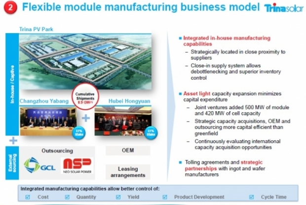 天合光能因此利用OEM、外包以及資產(chǎn)租賃的使用,填補(bǔ)其硅片切割和太陽(yáng)能電池產(chǎn)量與組件的缺口。