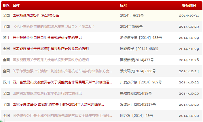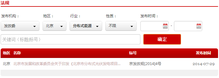1. 分類查詢:可按照發(fā)布機(jī)構(gòu)、地區(qū)、行業(yè)、性質(zhì)和發(fā)布時(shí)間進(jìn)行分類查找和篩選,可以單一條件也可以復(fù)合條件分類,比如可以選擇“發(fā)改委”“北京”“分布式能源”三個(gè)選項(xiàng),就可以直接查詢到“北京市發(fā)展和改革委員會(huì)關(guān)于印發(fā)《北京市分布式光伏發(fā)電項(xiàng)目管理暫行辦法》的通知”該條法規(guī)政策。