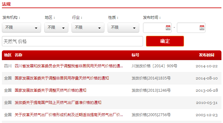 2. 快速搜索:可在搜索欄直接輸入關(guān)鍵詞、標(biāo)題或標(biāo)號(hào)等進(jìn)行搜索,便于快速查詢到目標(biāo)內(nèi)容。比如輸入“天然氣 價(jià)格”兩個(gè)關(guān)鍵詞,就可以得到“國(guó)家發(fā)展改革委關(guān)于調(diào)整天然氣價(jià)格的通知”等一系列相關(guān)結(jié)果。