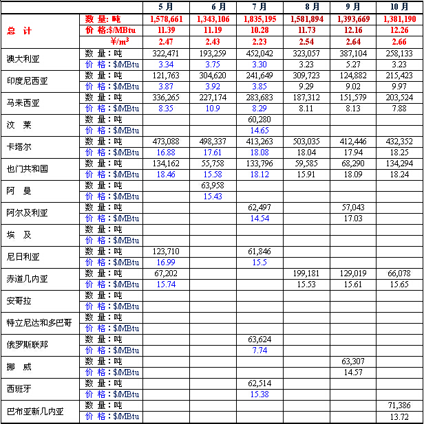 2014年中國液化天然氣進口數(shù)量和價格