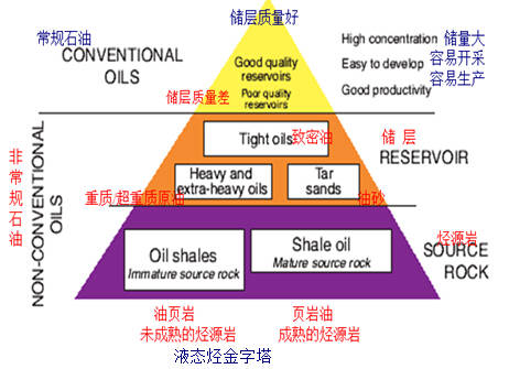 從液態(tài)烴金字塔來看,常規(guī)石油較非常規(guī)石油少得多。而非常規(guī)石油中富含干酪根的油頁巖儲量最大。