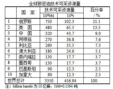 在石油價格大戰(zhàn)中提及的頁巖油是指致密油。根據(jù)美國能源情報署資助的先進(jìn)資源國際公司(Advanced Resources International, Inc.)于2013年的評價,俄羅斯致密油技術(shù)可采資源量最多,居世界第一,其次為美國和中國,三個國家的致密油技術(shù)可采資源量之和占世界總量的43.6%。