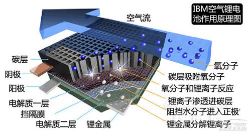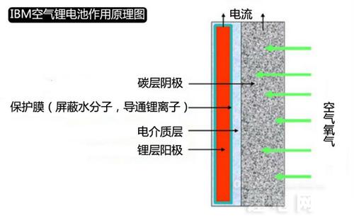 IBM空氣鋰電池的結(jié)構(gòu)如圖所示,陽極為鋰金屬板,陰極為表面碳層,中間有兩層電解質(zhì),其中靠近鋰金屬電板一側(cè)的電解質(zhì)負(fù)責(zé)接收由鋰金屬板釋放的鋰離子,而靠近碳層一側(cè)的電解質(zhì)則負(fù)責(zé)把接收到的鋰離子更好地滲透至碳層。兩種電解質(zhì)中間有阻擋膜,用以阻止不同層面物質(zhì)之間的相互滲透與污染。