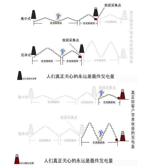 對于集中式逆變器方案而言,第一個過程直流側(cè)要經(jīng)過直流線纜、直流匯流箱及逆變器三座山,而組串型方案直流側(cè)只經(jīng)過直流線纜和逆變器兩座山,所以在這個過程集中型方案消耗的體力多點,也就是說我們看到的逆變器上的數(shù)據(jù)組串型剩的多。但是在第二個過程,由于集中型方案交流側(cè)的山只有線纜,而組串型還有匯流箱和線纜兩座山,而且由于組串型逆變器位置分散,距離箱變遠,因此爬山體力消耗遠大于集中式逆變器。所以最后集中式剩余的體力大于組串式。這個最終剩余的體力才對我們最有價值。