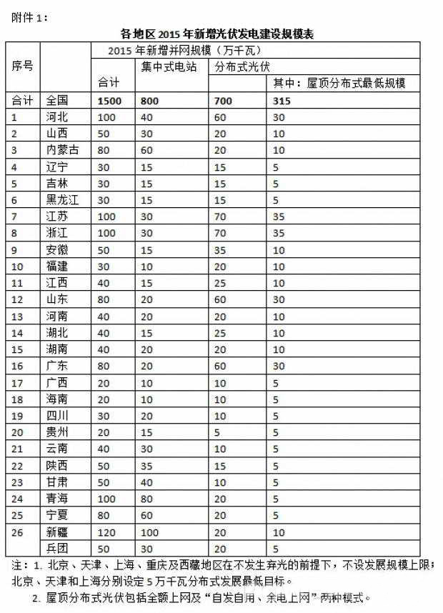 一,為穩(wěn)定擴(kuò)大光伏發(fā)電應(yīng)用市場,2015年全國新增光伏發(fā)電并網(wǎng)容量目標(biāo)為1500萬千萬(15GW)左右,其中集中式光伏電站800萬千萬,分布式光伏700萬千萬。綜合考慮屋頂分布式光伏發(fā)電項(xiàng)目的特點(diǎn)和各地區(qū)的建設(shè)條件,對各地區(qū)提出最低任務(wù)指標(biāo),但不設(shè)年度規(guī)模上限。