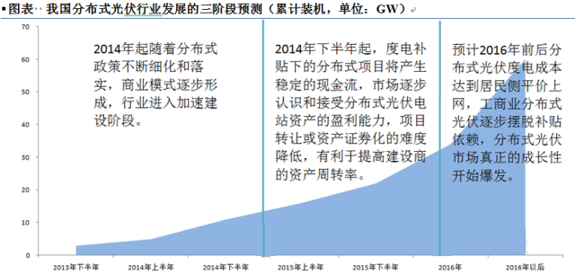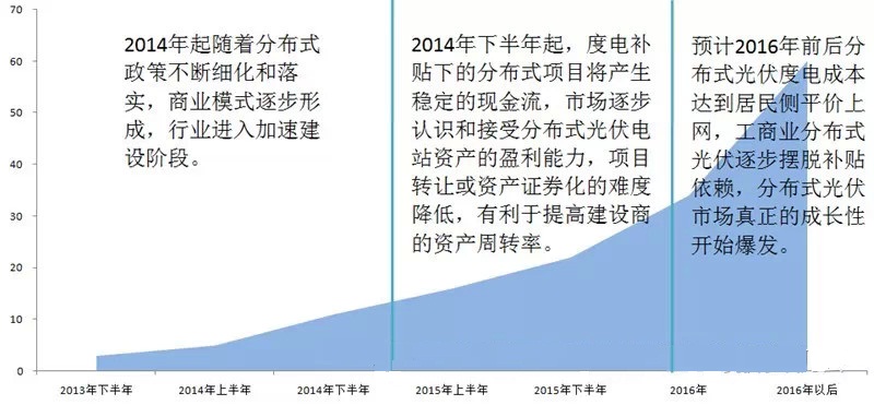 從14年年底到15年年初行業(yè)發(fā)生的一些變化來(lái)看,個(gè)人認(rèn)為分布式光伏行業(yè)應(yīng)該處于第一階段發(fā)展過(guò)程中(建設(shè)加速),并逐步進(jìn)入第二階段(融資口逐步放開(kāi))。