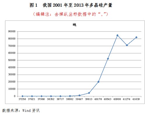 多晶硅是光伏產(chǎn)業(yè)最主要的原材料。我國多晶硅工業(yè)起步于上世紀(jì)50年代,但早期發(fā)展并不景氣。近年來隨著光伏市場的不斷發(fā)展,我國多晶硅產(chǎn)業(yè)獲得迅速發(fā)展,產(chǎn)量也得到迅速擴(kuò)張,從2005年到2013年,我國多晶硅產(chǎn)量從41噸迅速增至8.2萬噸,如圖1所示。