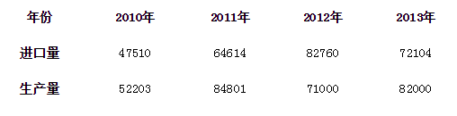 表2 2010—2013年我國高純度多晶硅進(jìn)口量與產(chǎn)量(單位:噸)