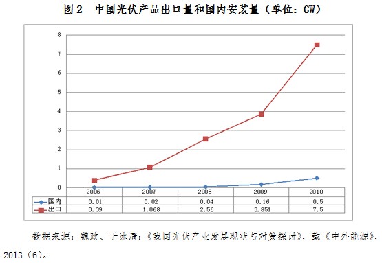 目前,我國光伏產(chǎn)業(yè)產(chǎn)能過剩的直接誘因是國內(nèi)市場需求過小,國外光伏市場尤其是歐洲市場的發(fā)展對(duì)我國光伏產(chǎn)業(yè)有重大影響。我國光伏應(yīng)用市場發(fā)展緩慢,并遠(yuǎn)遠(yuǎn)落后于我國光伏產(chǎn)業(yè)的發(fā)展。以2011年為例,我國當(dāng)年太陽能電池產(chǎn)量為13GW,而新增的光伏發(fā)電裝機(jī)容量僅約2.2GW,超過80%的太陽能電池要出口到歐洲、美國、日本等其他應(yīng)用國家,對(duì)國外市場依賴性過大使得光伏產(chǎn)業(yè)缺乏穩(wěn)定的市場基礎(chǔ),容易受到國際市場波動(dòng)影響,產(chǎn)業(yè)發(fā)展具有較大脆弱性。
