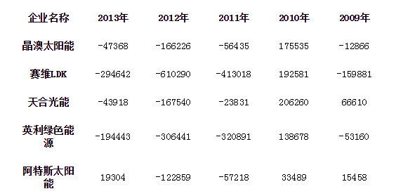 從以上分析可以看出,國內(nèi)產(chǎn)能迅速擴(kuò)張與市場需求緩慢增長致使光伏產(chǎn)業(yè)產(chǎn)能過剩,同時(shí)外需增長乏力、“雙反”政策撲面襲來等,各種國內(nèi)外不利因素涌現(xiàn),我國光伏行業(yè)走到了十字路口。從表4可以看出,我國光伏行業(yè)主要企業(yè)凈利潤在2010年之后明顯下降,整個(gè)光伏行業(yè)陷入困境,到2012年末虧損最為嚴(yán)重。從2013年的凈利潤指標(biāo)來看,光伏行業(yè)有回暖趨勢但仍不樂觀。
