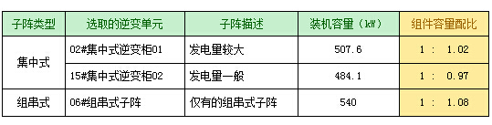 研究分析選取五天太陽(yáng)能資源輻射條件較好的時(shí)間段,分別選取兩個(gè)集中式逆變單元與同一個(gè)組串式逆變器子陣進(jìn)行對(duì)比分析,三個(gè)子陣的具體裝機(jī)信息如下表所示: