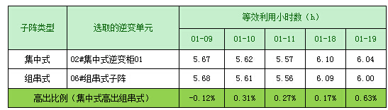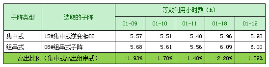 本次選取的集中式逆變單元為02#集中式逆變柜01,發(fā)電量較好,與組串式06#組串式子陣,為客觀對(duì)比分析集中式子陣與組串式子陣的發(fā)電量,排除裝機(jī)容量的影響,分析結(jié)果如下表所示: