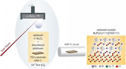 該團(tuán)隊(duì)使用脈沖激光沉積技術(shù)共沉積外延的δ-Bi2O3和無序的金屬鉑。薄膜在空氣中退火,使得鉑被氧化,形成長(zhǎng)度約100納米的外延Bi2Pt2O7晶體。