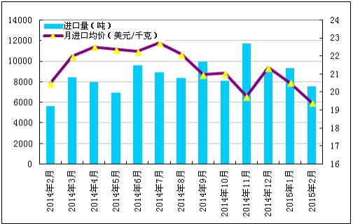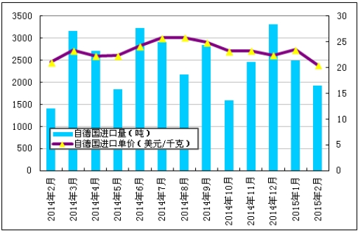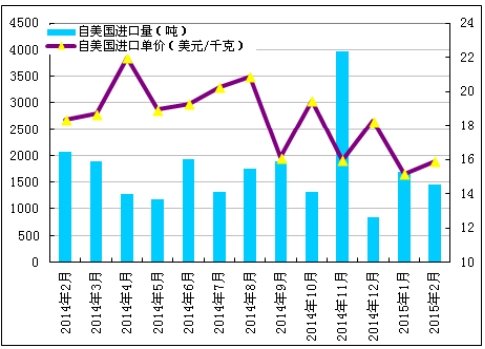 圖1 2014年2月-2015年2月多晶硅進(jìn)口量及進(jìn)口均價(jià)示意圖數(shù)據(jù)來(lái)源:海關(guān)
