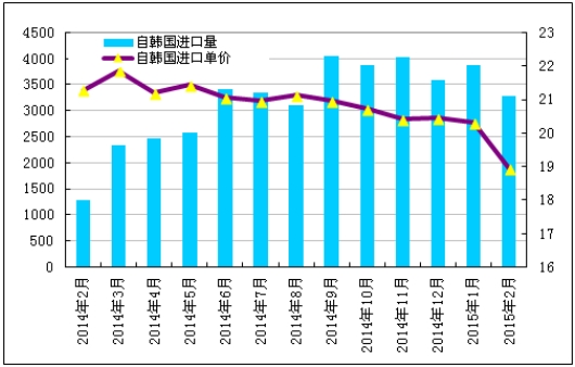 2015年2月份從韓國(guó)進(jìn)口多晶硅量減少至3286噸,環(huán)比減少15.0%;2月份進(jìn)口單價(jià)小幅下滑至18.95美元/千克,環(huán)比降幅為6.7%。