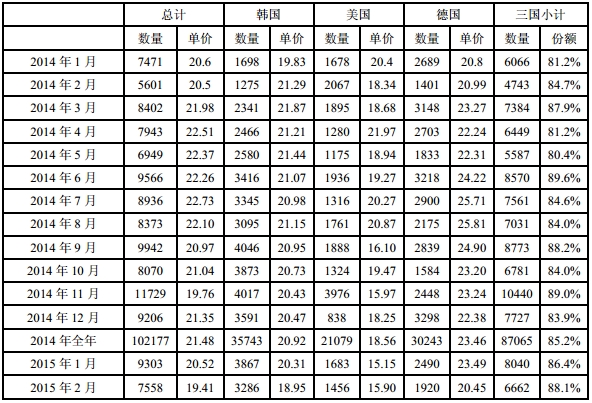 表1 2014年-2015年我國(guó)多晶硅進(jìn)口情況(單位:噸、美元/千克)
