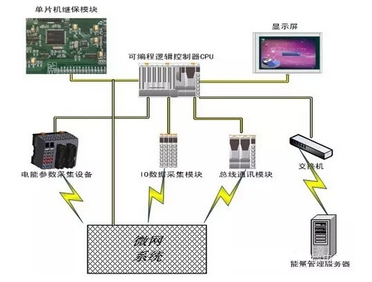 本文提出的微電網(wǎng)技術(shù)解決方案由微電網(wǎng)控制保護(hù)裝置和能量管理系統(tǒng)組成。其中微網(wǎng)控制保護(hù)裝置包括可編程邏輯控制器CPU,單片機(jī)繼保模塊、數(shù)字量模擬量數(shù)據(jù)采集設(shè)備,電能參數(shù)采集設(shè)備,總線通訊設(shè)備,光纖通訊設(shè)備、顯示屏組成。