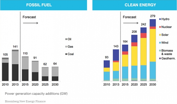 彭博新聞社旗下的咨詢公司彭博新能源金融(the Bloomberg New Energy Finance)近日在紐約舉辦年會。其創(chuàng)始人Michael Liebreich在會上表示,2013年開始,全球可再生能源發(fā)電產(chǎn)能增加143GW(十億瓦),已經(jīng)超過化石燃料新增產(chǎn)能141GW。
