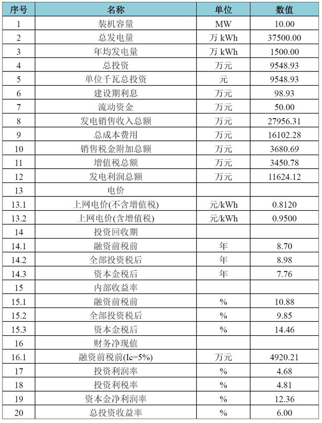 測算條件:單位千瓦造價為9400元,裝機容量為10MW,年滿發(fā)小時數(shù)為1500h,電價為0.95元/kWh