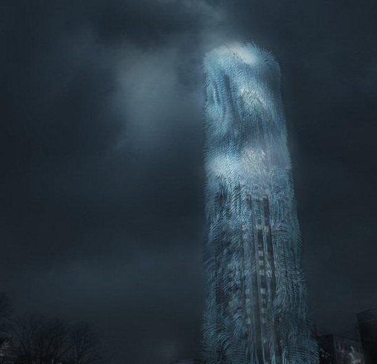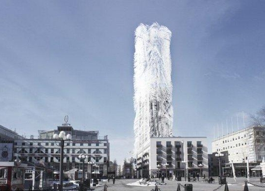 藝術(shù)家描繪的瑞典首都“多毛摩天大樓”,這種多毛結(jié)構(gòu)事實上是纖細的纖維體,隨風(fēng)飄動可將風(fēng)能轉(zhuǎn)化為電能