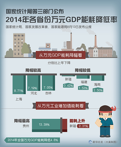 國家統(tǒng)計局、國家發(fā)展改革委、國家能源局13日發(fā)布公報,公布了2014年各省區(qū)市萬元地區(qū)生產(chǎn)總值(GDP)能耗降低率等指標(biāo)。