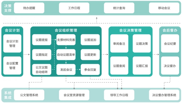 第四,加強綜合管控,深化體系統(tǒng)籌,實現(xiàn)會前、會中和會后的全業(yè)務鏈管理。特別是與決議督辦系統(tǒng)整合后,相關人員可以督辦、跟蹤會議決議的執(zhí)行情況,進一步提高會議的價值。