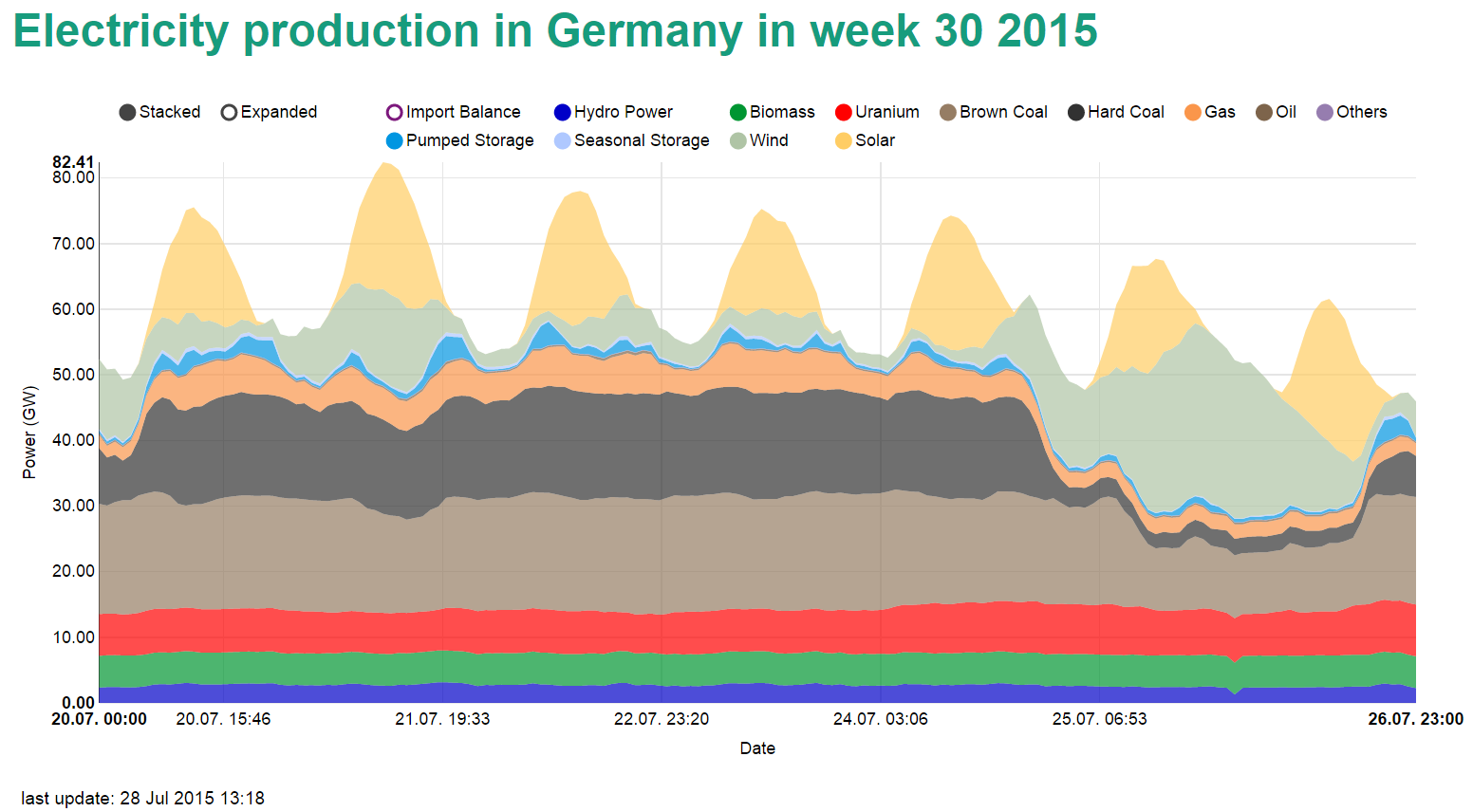 圖1:德國(guó)2015年第30周的電力生產(chǎn);來(lái)源:EnergyCharts.de