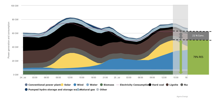 2015年的7月25日(周六),德國(guó)的可再生能源發(fā)電短期內(nèi)錄得了新高:78%,這比之前的74%又提高了4個(gè)百分點(diǎn)。這次突破記錄的原因主要在于自然條件恰逢其時(shí)。在7月底的時(shí)候,Zeljko暴風(fēng)襲擊了歐洲北部,大風(fēng)造成了不小的損失,甚至某些地方還出現(xiàn)了洪水;可是德國(guó)北部也就是強(qiáng)風(fēng)吹過(guò)的地區(qū)正是德國(guó)風(fēng)電裝機(jī)最多的地方。與此同時(shí),德國(guó)南部光照很好,這里也是德國(guó)太陽(yáng)能裝機(jī)最多的地方。這種自然條件的完美匹配給可再生能源發(fā)電創(chuàng)紀(jì)錄的高比例提供了充分條件。
