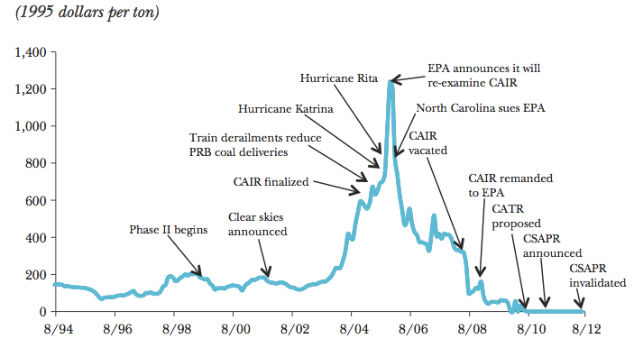 圖:二氧化硫配額價(jià)格與監(jiān)管環(huán)境的變化(以1995年美元每噸計(jì))