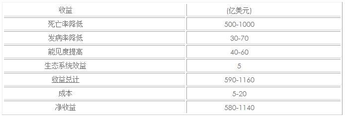 表:美國(guó)二氧化硫排污權(quán)交易計(jì)劃每年帶來的收益(以2000年美元計(jì),單位為億美元)