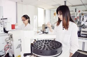 實(shí)驗(yàn)室工作人員對(duì)污水樣品進(jìn)行檢測(cè)
